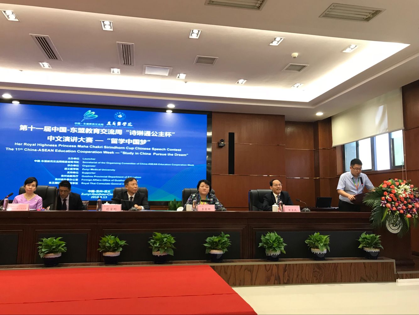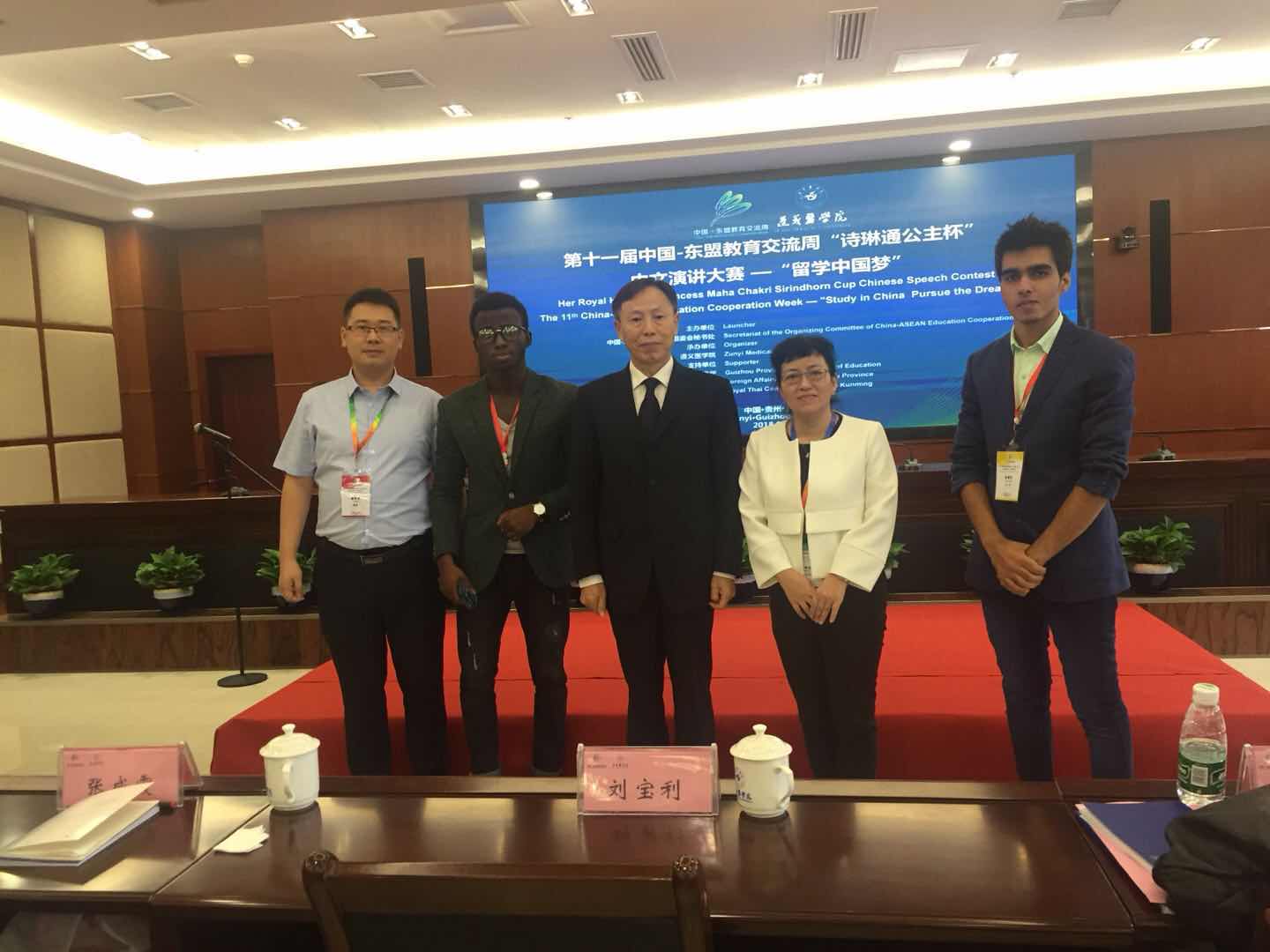 9月13日,在李玉琼院长和陈琛老师的带领下,我院2015级巴基斯坦籍来华留学生可汗与2016级尼日利亚籍国际学生千羽赴遵义医学院参加了“第十一届中国-东盟教育交流周中文演讲大赛暨征文大赛”。遵义市副市长李莲娜、中国-东盟教育交流周组委会秘书处执行秘书长刘宝利、贵州省外事办公室党组成员、省友协专职副会长蒋红、泰王国驻昆明总领馆总领事妮媞瓦娣·玛尼绲等嘉宾出席了此次大赛。开幕式上陈琛老师作为优秀指导教师代表进行了发言。