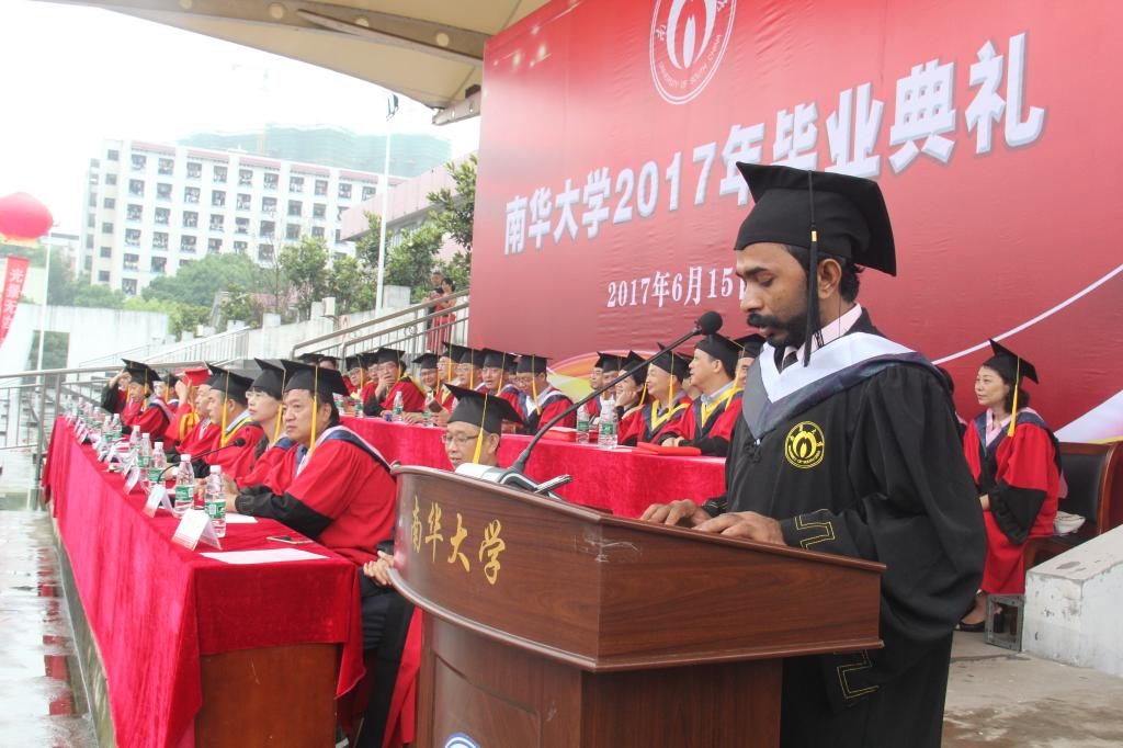The USC north campus stadium witnessed this commemorative moment. With the resounding national anthem of P.R.China, a solemn flag-raising ceremony lifed the curtain of 2017 USC Commencement and Degree Conferring Ceremony. After the president of the university announced the degree awarding document, 15 international students collectively stepped onto the rostrum to receive their diploma and degree. Later, Ameer Sajid, a Pakistani MBBS graduate, on behalf of all the batch members, delivered a speech expressing their appreciation and gratitude towards their Alma Mater- the University of South China, towards all the teachers that had helped them in their process of pursing study, and also giving best wishes to all graduates of 2017. Thunderous applause greeted his heartfelt speech.
