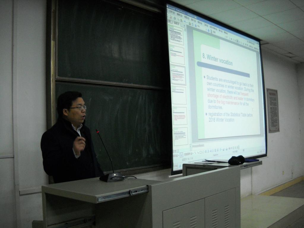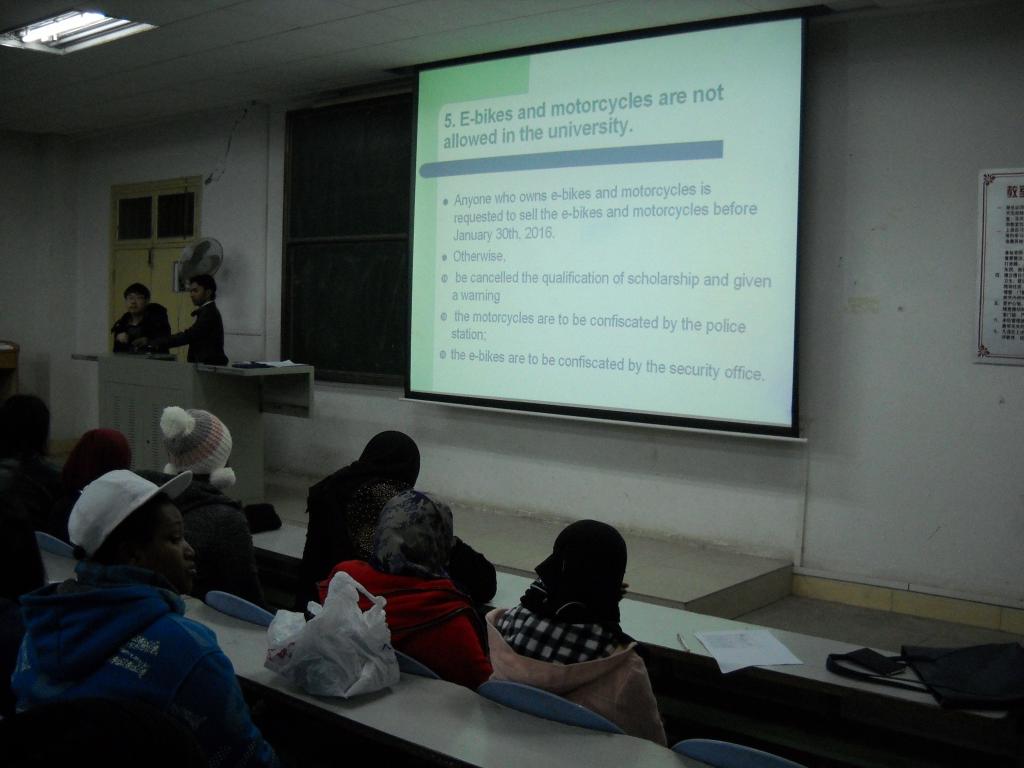 1月13日晚上八点,国际学院学工室在第九教学楼101大教室召开了全院留学生教育大会。大会就考风考纪、宿舍留宿他人问题、晚归未归问题、校园内禁电禁摩、违规用电问题、禁止非法打工、预防艾滋病、寒假留校生管理规定等八项专题对全体留学生进行了思想和纪律教育。