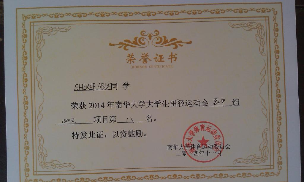 2014级汉修班来自埃及的SHEREF ABDELMONEIM MOHAMED ABDELMONEIM ELSHENAWI同学,在1500米比赛中获得第8名,为国际学院获得了第一个奖项,为学院争了光添了彩。同时他也被评为beats365唯一官方网站2014年田径运动会优秀运动员。
