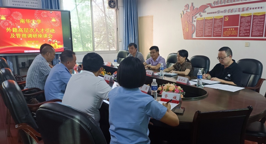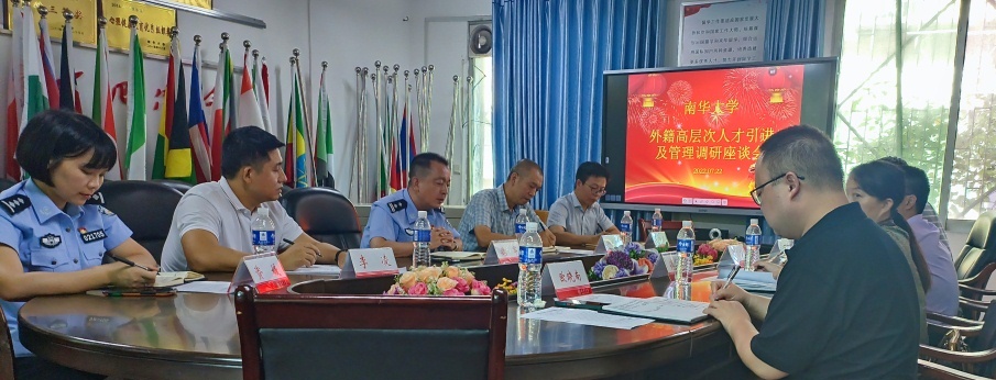 7月22日下午,衡阳市科学技术局、衡阳市公安局人口与出入境管理支队等外事相关部门来我校走访,就外籍高层次人才的引进和管理开展调研座谈。人力资源处副处长章求才、国际交流与合作处副处长傅华丽以及数理学院院长林文斌参加了此次座谈,座谈会由傅华丽主持。