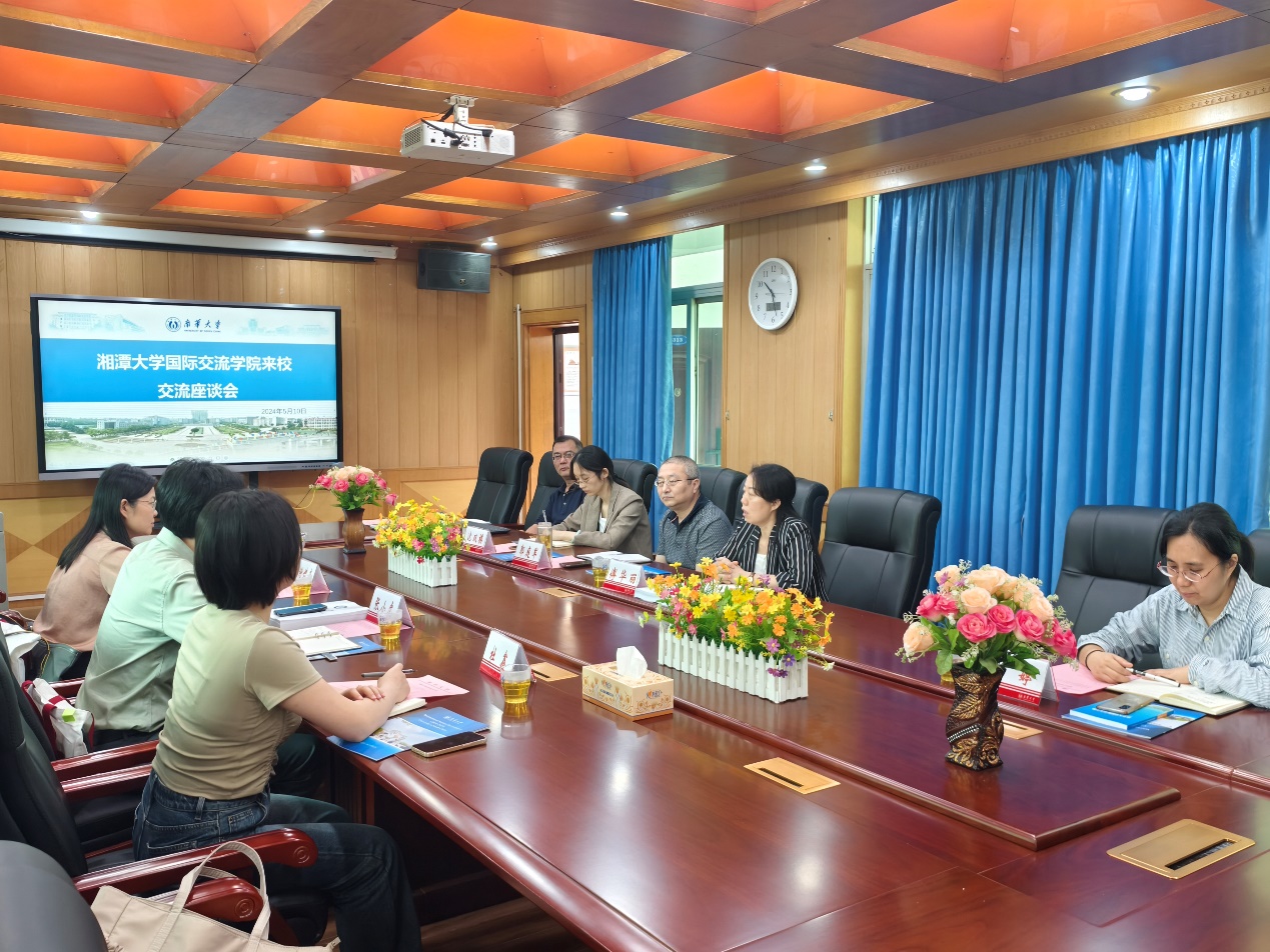 2024年5月10日上午,湘潭大学国际交流学院张小虎副院长一行来院交流调研。会议由国际学院院长傅华丽主持,国际学院综合、教务、招生、学工等科室负责人参与了此次会议。