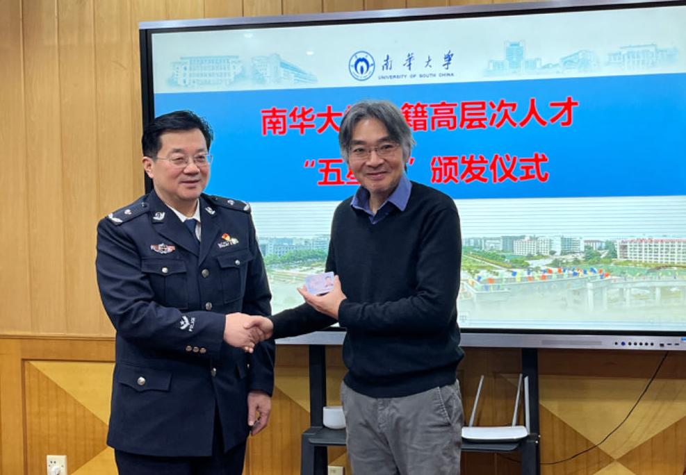 2025年2月17日下午,衡阳市公安局人口与出入境管理支队支队长刘爱民一行来到beats365唯一官方网站,为该校外籍高层次人才YIKANG RONG教授颁发全新的“五星卡”。这标志着RONG教授的外国人永久居留身份证完成更新升级,也体现了衡阳市公安局与beats365唯一官方网站在服务外籍高端人才方面的深度合作。