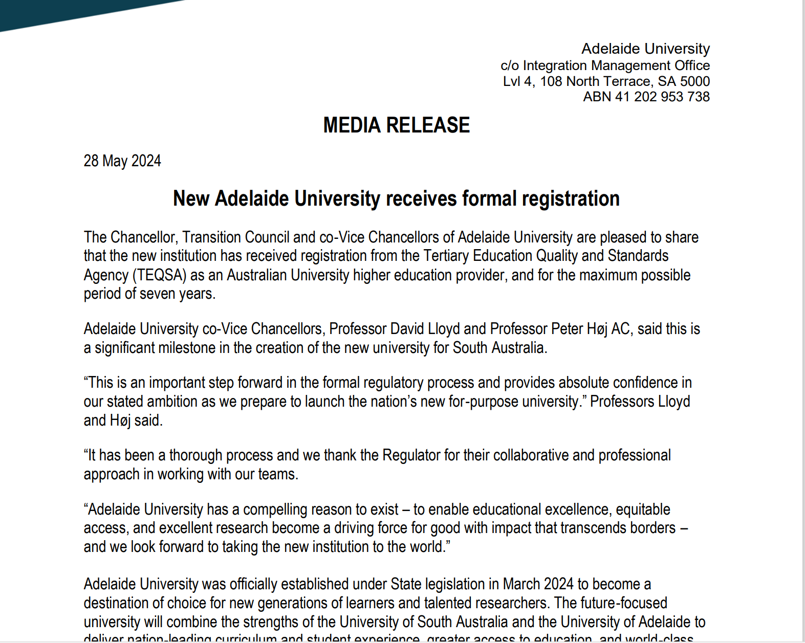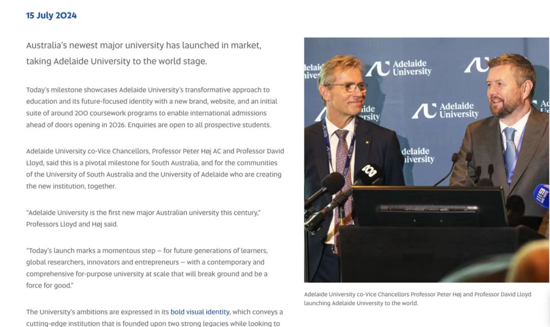 今年4月官网发布新阿德莱德大学正式注册,并于7月15日宣布由南澳大学(QS340)与阿德莱德大学(QS82)正式合并为Adelaide University。